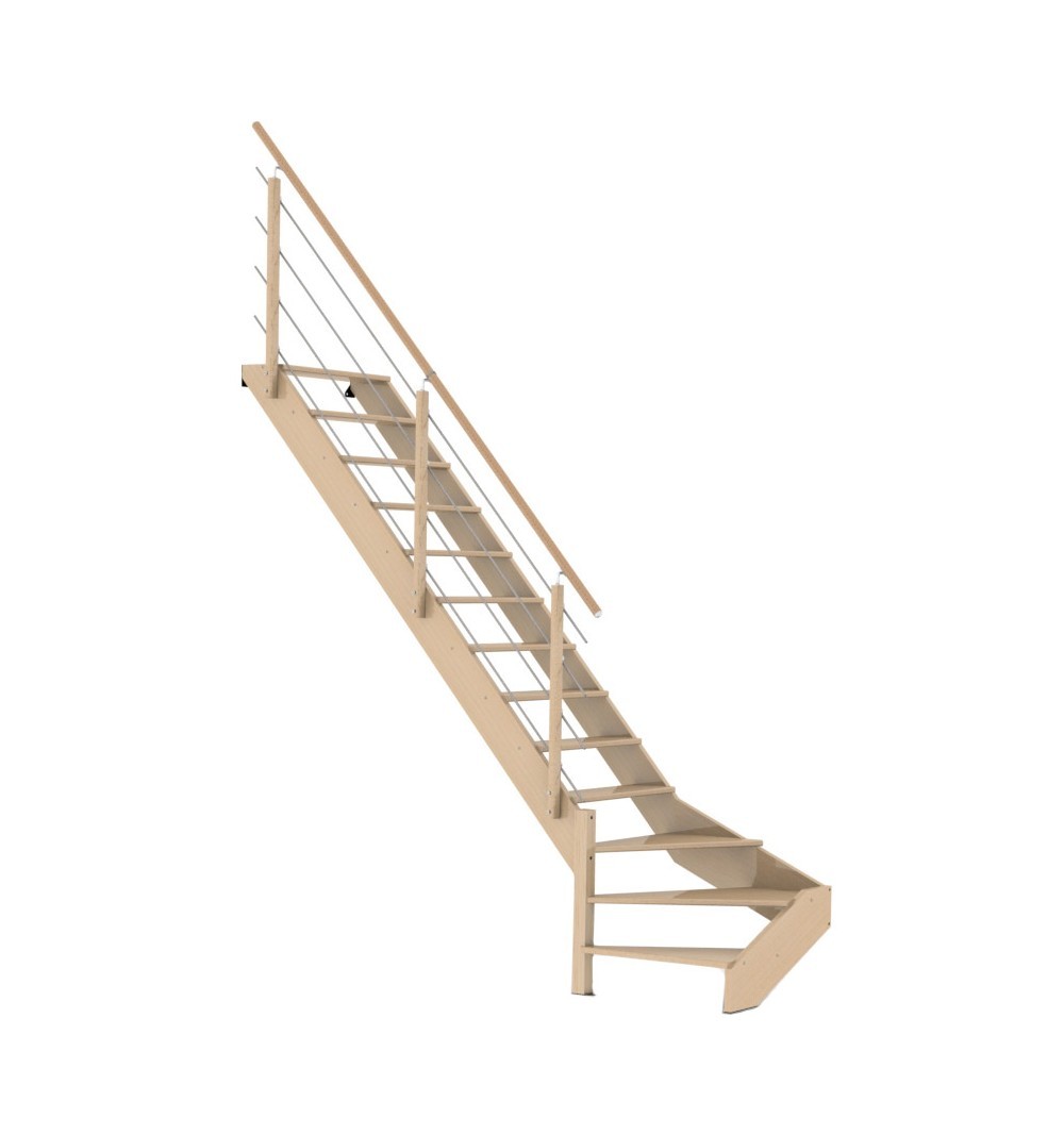 Escalier complet: 13 marches, limons, garde-corps complet sur 1 côté, platines de fixation au sol.